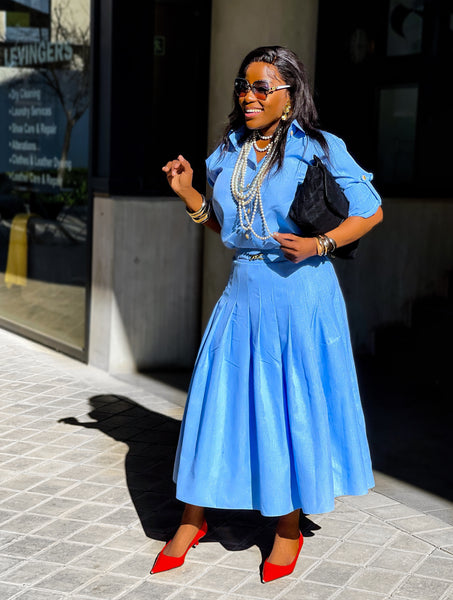 Turn heads in this vibrant sunshine Baby Blue two-piece set, designed for the confident woman who loves to shine. The set features a tailored button-down shirt with a crisp collar and long sleeves, paired with a flowy pleated maxi skirt that moves beautifully with every step.