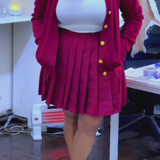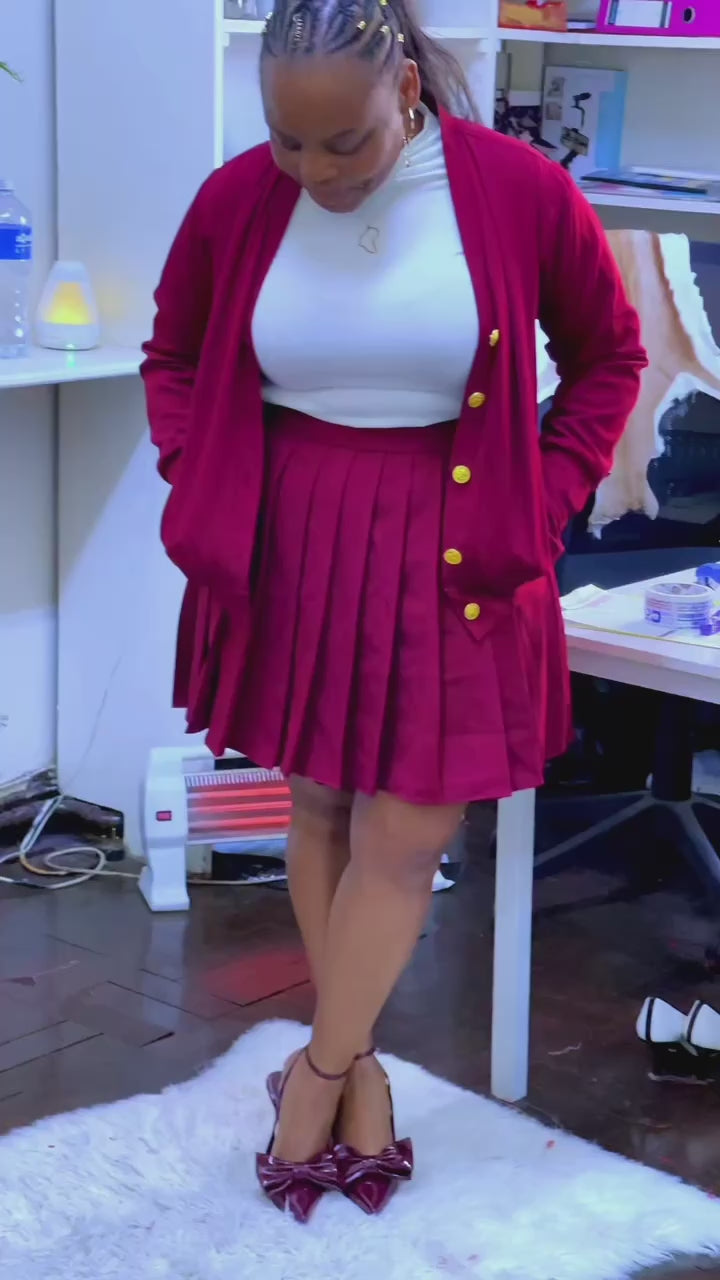 * Pleated Skirt with Matching Cardigan Top and a matching Burgundy Turtleneck.