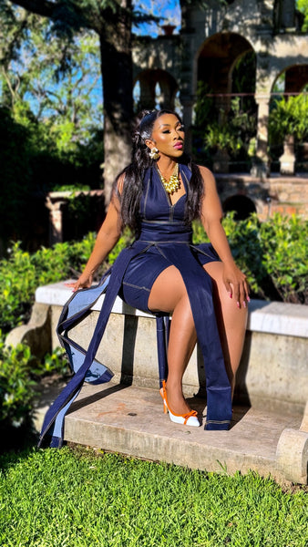 * Step into the festive season like royalty with The Midnight Monarch Denim Ensemble — a striking fusion of elegance, power, and playful opulence. Crafted in rich midnight blue denim, this sculpted short-suit features elongated statement drapes that glide with every step, creating a regal, commanding silhouette.